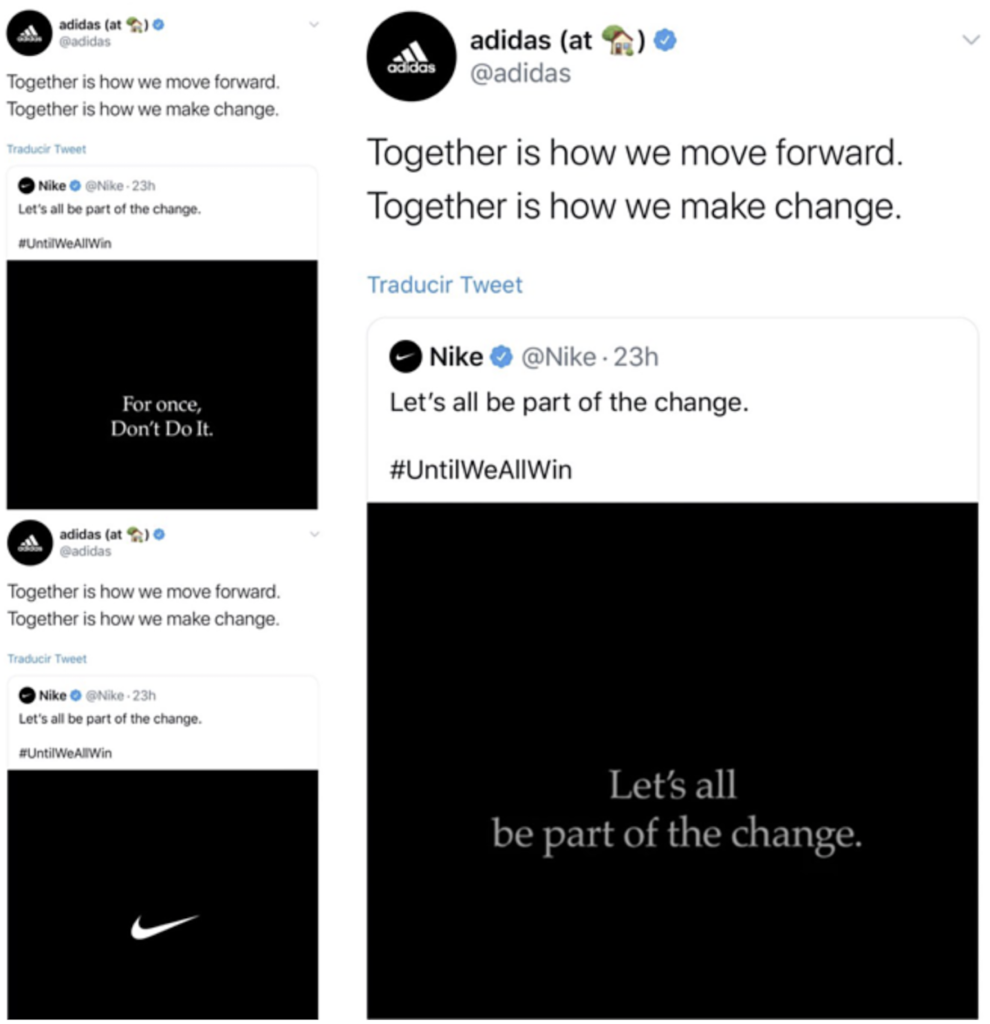 > En los Estados Unidos, la muerte de George Floyd el 25 de mayo de 2020 bajo arresto policial desató protestas e ira globales por el racismo sistémico. Muchas marcas respondieron rápidamente. Nike publicó un tweet el 29 de mayo que decía “Seamos todos parte del cambio” junto con un video en contra del racismo con el mensaje “Por una vez, no lo hagas”. Al día siguiente, Adidas respondió: “Juntos es cómo avanzamos. Juntos es cómo hacemos el cambio ”, en solidaridad con el mensaje de Nike: