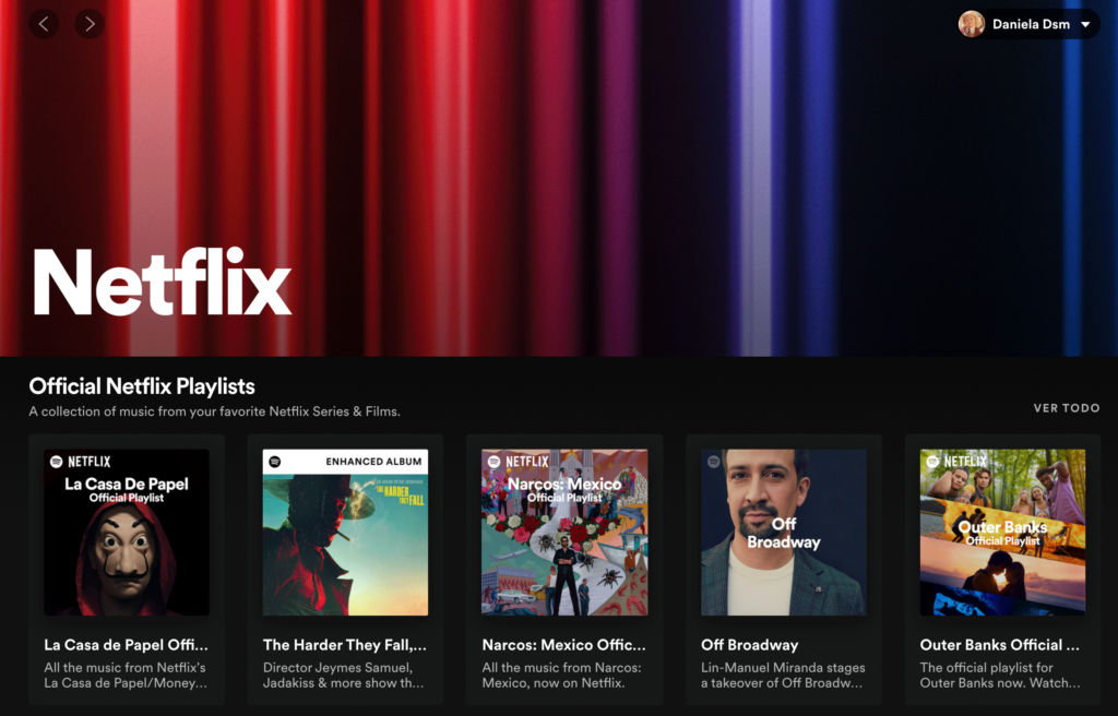 El servicio de transmisión de música Spotify lanzó un Netflix Hub , lo que facilita a los usuarios el acceso a las bandas sonoras y listas de reproducción oficiales de varios programas populares de Netflix en su plataforma.
