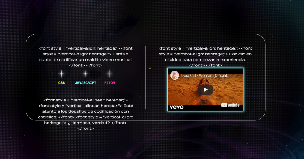 En cuatro puntos de la versión DojaCode de Woman, invita a los espectadores a editar fragmentos de código, lo que genera cambios en el video en tiempo real. Desde elegir un color de uñas para Doja Cat hasta hacer coincidir el cielo en pantalla con su zona horaria local, los usuarios son introducidos de manera divertida a CSS, JavaScript y Python. Una vez que finaliza el video, pueden compartir las escenas que han recodificado.