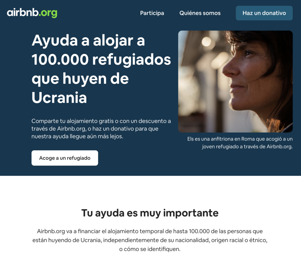Airbnb financia 100.000 lugares en Europa para alojar a refugiados y usa su plataforma como medio para que las personas donen el espacio por su cuenta o apliquen descuentos. Airbnb, además, en caso que las personas decidan donar el espacio no cobra comisión y brinda un seguro por 1 millón de dólares por daños a la propiedad y otro por responsabilidad civil. Esta no es la primera vez que la empresa ayuda a albergar refugiados: durante los últimos cinco años, Airbnb.org brindó alojamiento temporal a más de 54.000 refugiados y asilados de Siria, Venezuela, Afganistán y otros países.