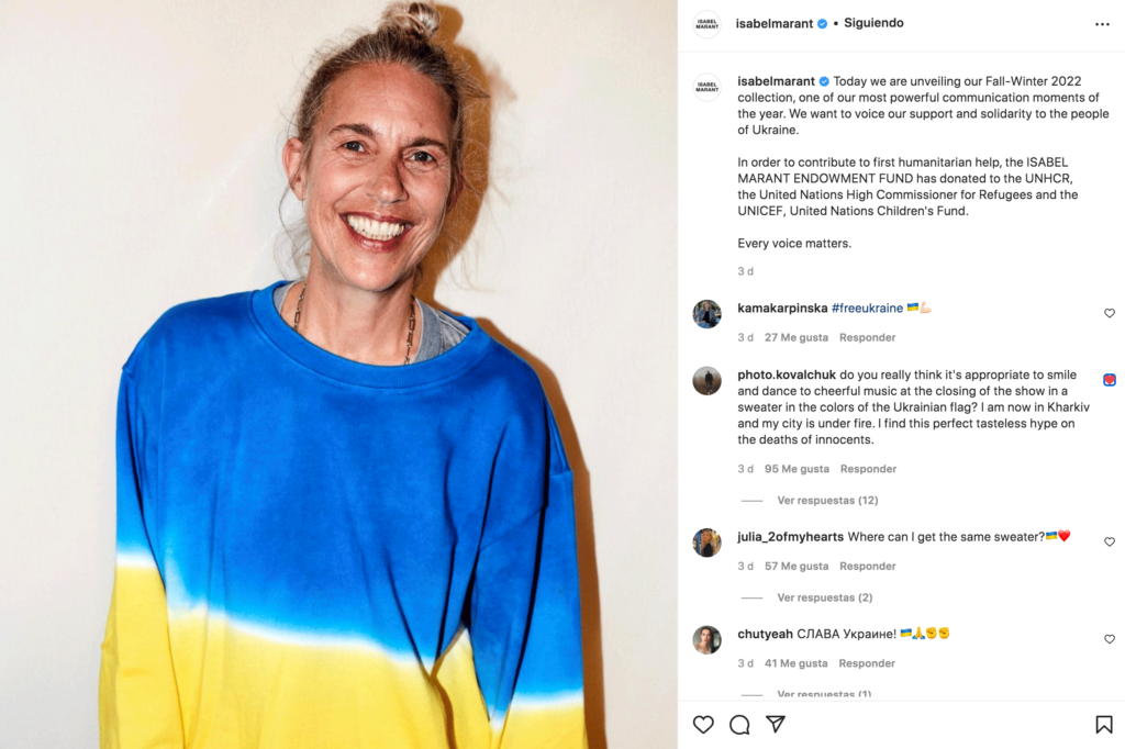 Otra iniciativa fue la de la marca Marant. La mismísima Isabel Marant aparece en una foto en instagram sonriendo (?) y llevando un buzo con los colores de la bandera de Ucrania comunicando que hacen una donación -no especifica el monto ni si es a través de vender buzos o cómo- en solidaridad con la causa. Todo esto en un post donde, a su vez, cuenta que ese día lanzan la colección Otoño – Invierno 22 y que es uno de los momentos más poderosos del año.