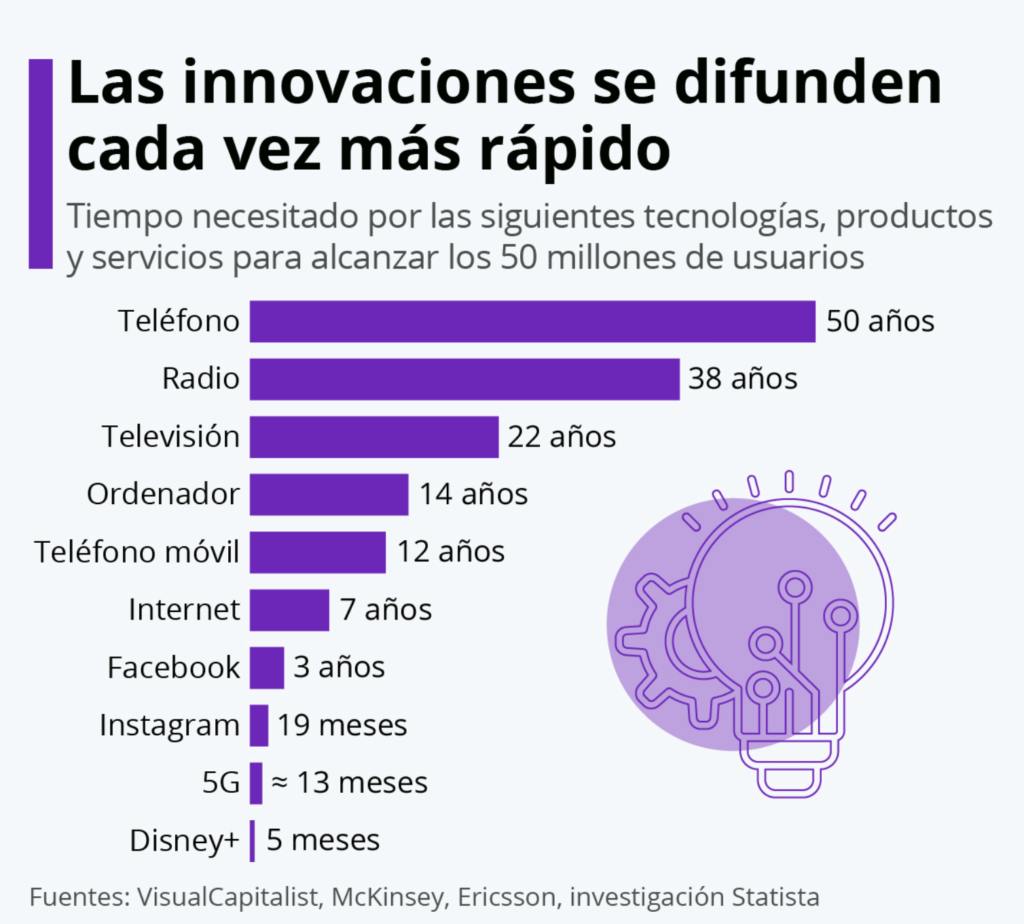 Hoy, se necesita mucho menos tiempo para llevar al mercado una nueva idea, también menos tiempo para difundirla, por lo que, la segunda y tercera fase de Moore -aplicación y difusión- se reducen drásticamente y el ritmo de difusión se está acelerando con una rapidez asombrosa. Las innovaciones tecnológicas no combinan y recombinan dispositivos y tecnologías solamente. Los nuevos dispositivos también impactan en cambios sociales, filosóficos y hasta psicológicos. Alteran todo el medio intelectual del hombre, su manera de pensar y su visión del mundo.