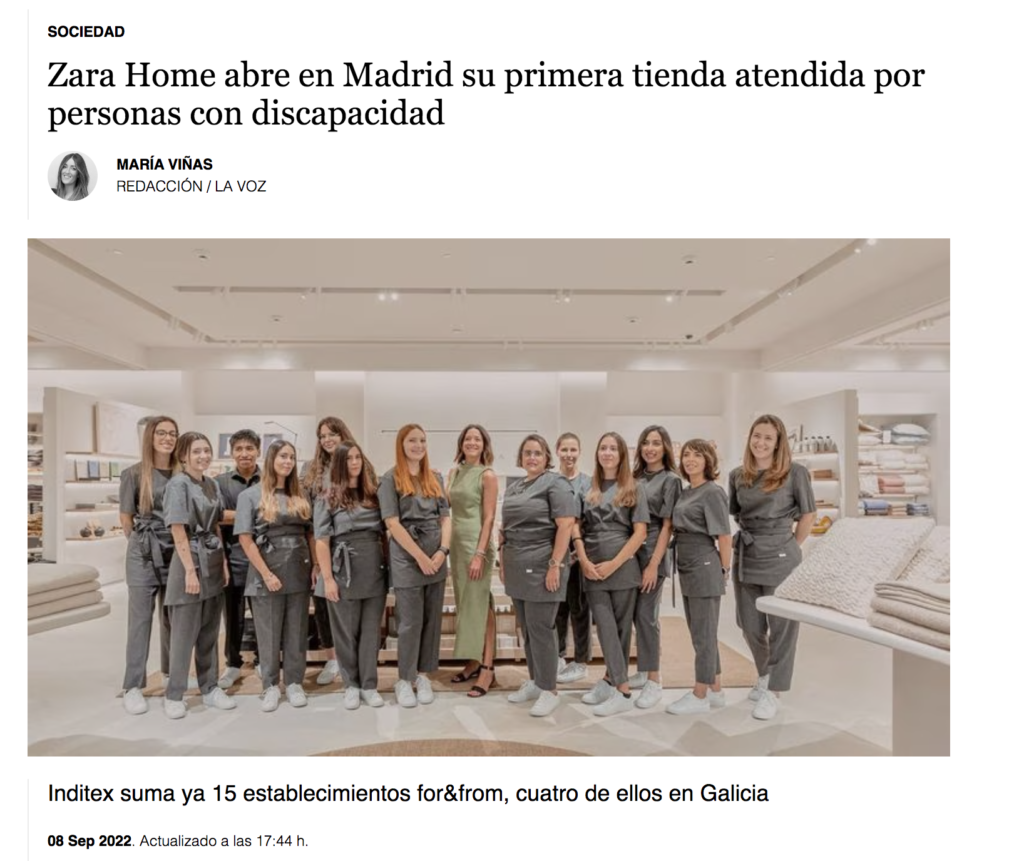 “Hace 20 años que Inditex abrió en Palafolls (Barcelona) su primera tienda for&from, una red de outlets de sus distintas franquicias que da empleo a personas con discapacidad y trastornos mentales. Hoy son 15 los establecimientos que funcionan bajo este concepto —14 en España y uno en Italia—, todos gestionados íntegramente por organizaciones especializadas. Zara Home ha sido la última en unirse a la lista.