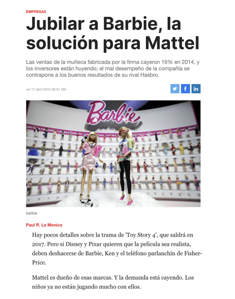 Las ventas se desplomaban rápidamente desde 2012, a primera vista en Mattel creyeron que otros juguetes, los electrónicos, estaban atrayendo la atención de sus clientas desplazando a la tradicional muñeca, pero no. Muchas veces, las empresas en estas situaciones buscan culpables fuera cuando en realidad deben colocar el foco dentro. Mirar para afuera hace perder tiempo, enfoque y dirige las discusiones en el sentido equivocado.